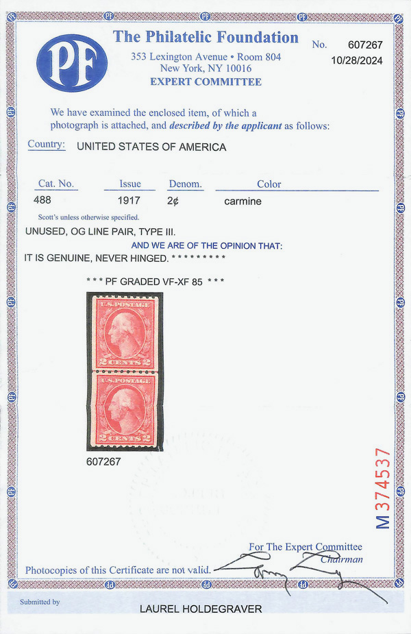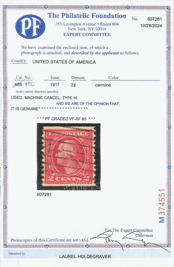 7117 O 492 image1916, 2¢ carmine, type III, unwatermarked, rotary press coil, perf. 10 vertically (Scott 492), identified as #488 in error but graded accurately, Very Fine to Extremely Fine, with 2024 P.F. certificate graded VF-XF 85.