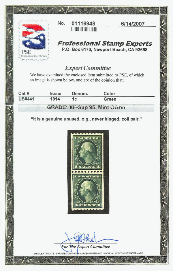 7109 nh 441 image1914, 1¢ green, S.L. watermark, flat plate coil, perf. 10 horizontally (Scott 441), pair, o.g., never hinged, Extremely Fine to Superb, with 2007 P.S.E. certificate graded XF-SUP 95.
