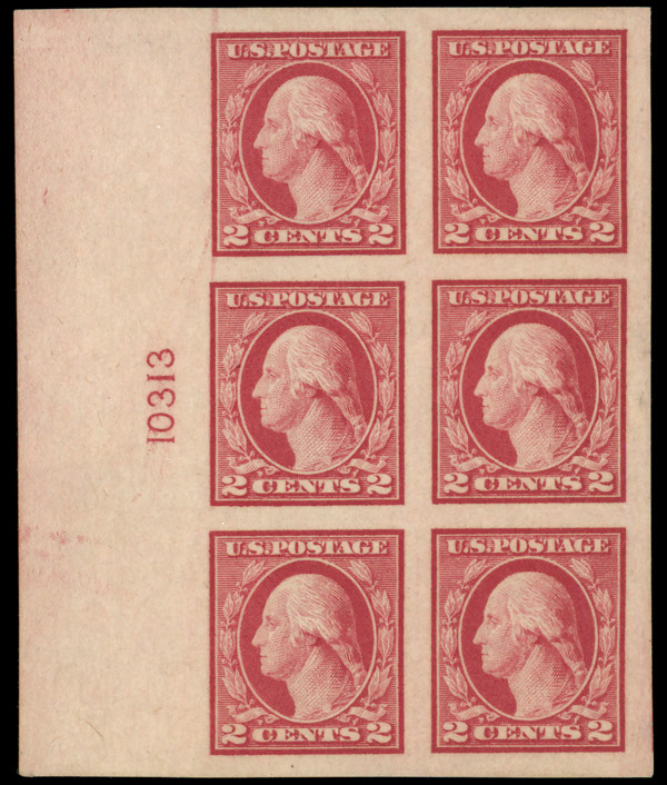 7114 ogbl 482 image1916, 2¢ carmine, type I, unwatermarked, imperf. (Scott 482), plate block of 6, o.g., hinge remnants, Extremely Fine to Superb.