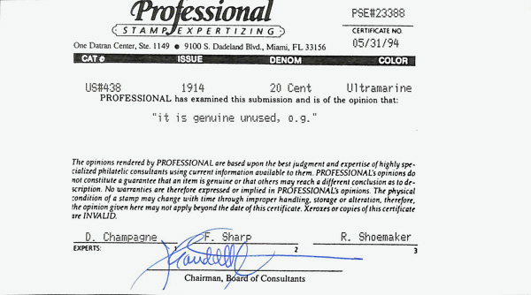 7108 og 438 image1914, 20¢ ultramarine, S.L. watermark, perf. 10 (Scott 438), o.g., lightly hinged, Very Fine to Extremely Fine, with 2024 P.S.A.G. certificate graded VF-XF 85 & 1994 P.S.E. photo certificate.