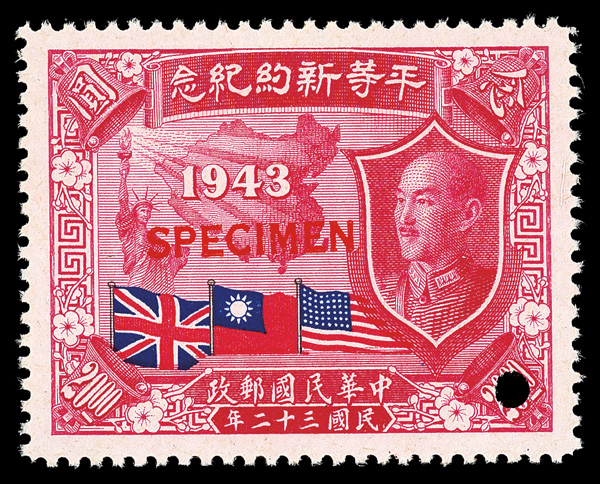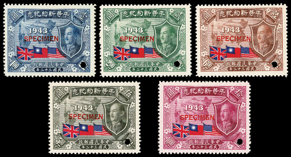 8175 Snh 845-850 image1945, Treaties of Equality complete, "Specimen" overprints (Chan 845-850. Scott 593-598), each fresh-faced and mathematically centered, with red straightline "SPECIMEN" overprint and security hole punch at lower right, o.g., never hinged; toned gum, still Very Fine to Extremely Fine. (Image) (Image2) (Image3) (Image4) (All Images)