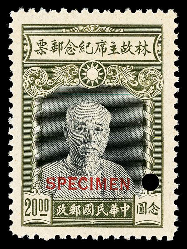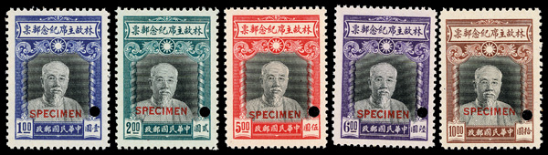 8176 Snh 851-856 image1945, Lin Sen complete (Chan 851-856. Scott 599-604), bright and crisp with red straightline "SPECIMEN" overprint and security punch at right, o.g., never hinged; toned gum as often, Very Fine. (Image) (Image2) (Image3) (Image4) (All Images)