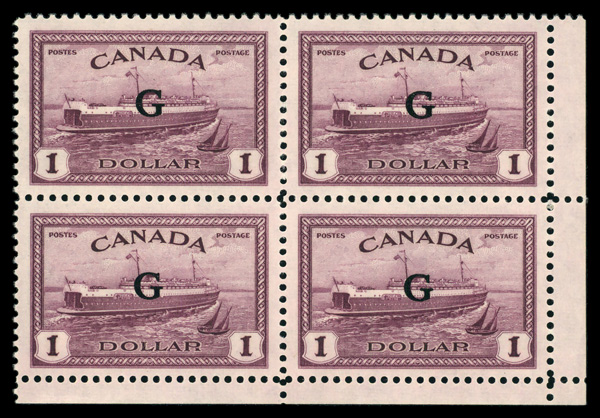 8170 O25 imageOfficial, 1950, $1 red violet 'G' overprint (Scott O25), block of 4, o.g., never hinged, Extremely Fine.