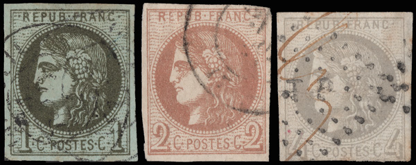 8183 O 38-40 image1870, Bordeaux, 1c, 2c & 4c (Scott 38-40), 1c & 2c with nice margins; 4c touching at the bottom with a light crease, otherwise Fine to Very Fine.