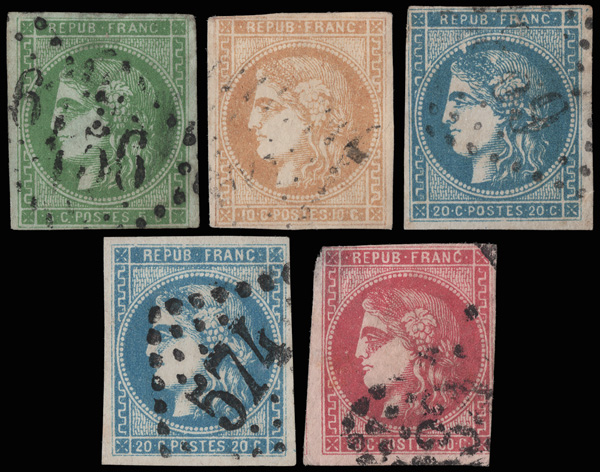 8184 O 41, 42, 44, 45, 48 image1870, Bordeaux, 5c, 10c, 20c types II-III & 80c (Scott 41, 42, 44, 45, 48); 80c 3½ margins & thin, otherwise Fine to Very Fine.