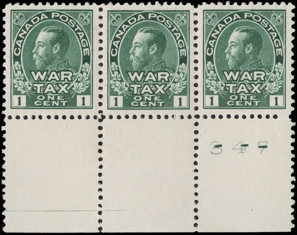 8163 nh/og MR1 imageWar Tax, 1915, King George V "Admiral", 1¢ green (Scott MR1), bottom sheet margin strip of 3 with Plate No. 347, o.g., hinged in the ungummed part of the selvage, stamps never hinged, bright, fresh and incredibly well centered, Extremely Fine, with a 2022 P.S.E. certificate.