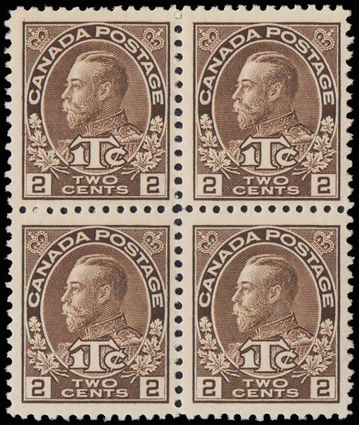 8165 nhbl MR4 imageWar Tax, 1916, King George V "Admiral", 2¢+1¢ brown, type II (Scott MR4), block of 4, o.g., never hinged, nicely centered; but the bottom stamps with tiny thin spots, Fine to Very Fine appearance, with a 2020 P.S.E. certificate graded VF-XF 85.