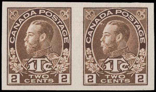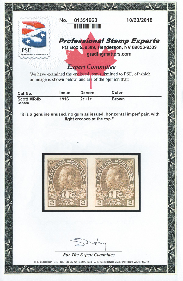 8166 ng MR4b imageWar Tax, 1916, King George V "Admiral" 2¢+1¢ brown, type I, imperf (Scott MR4b), without gum as issued, large balanced margins; light creases at the top (per accompanying certificate), Very Fine appearance, with a 2018 P.S.E. certificate.