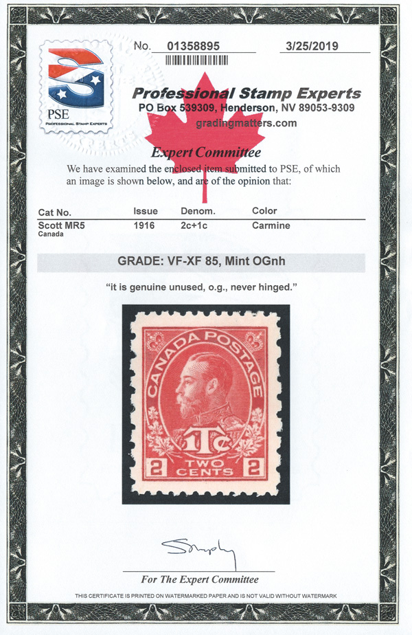 8167 nh MR5 imageWar Tax, 1916, King George V "Admiral", 2¢+1¢ carmine, type I, perf. 12 x 8 (Scott MR5), o.g., never hinged, fresh, bright and beautifully centered, Very Fine to Extremely Fine, with a 2019 P.S.E. certificate graded VF-XF 85.