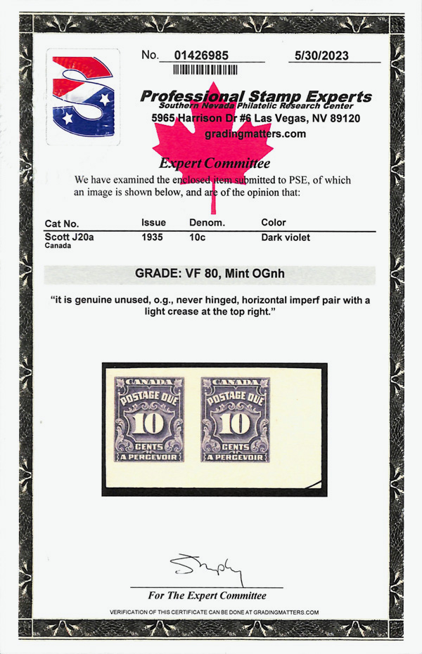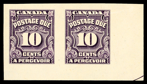 8161 nh J20a imagePostage Due, 1935, 10¢ dark violet, imperforate pair (Scott J20a), o.g., never hinged, Post Office fresh bottom right horizontal pair with part arrow; light crease at top right, Very Fine, only 100 pairs issued, with 2023 P.S.E. certificate graded VF 80.
