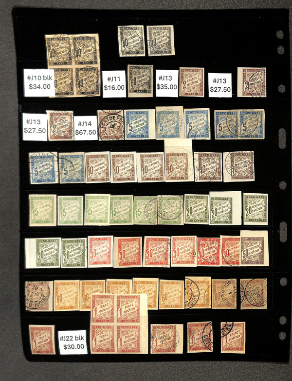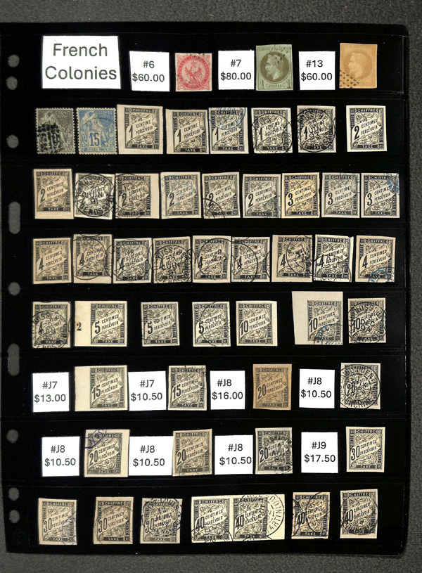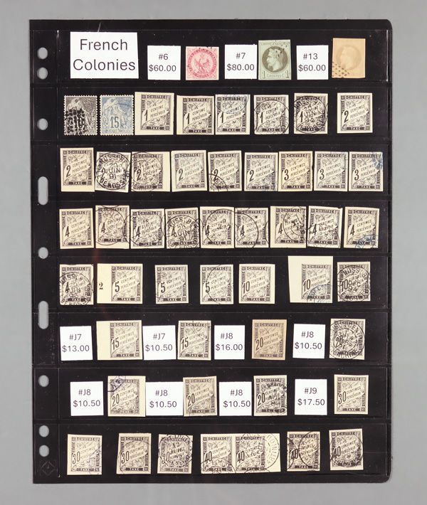 8187   imageFrench Colonies, Front and back of book 1865-1870, 110+ mixed used and unused French Colonies on a Vario stock page; includes #6//51 and J1//J22; better items include #6, 7, 13, and J14; catalog $870, Fine to Very Fine. (Image) (Image2) (Image3) (All Images)