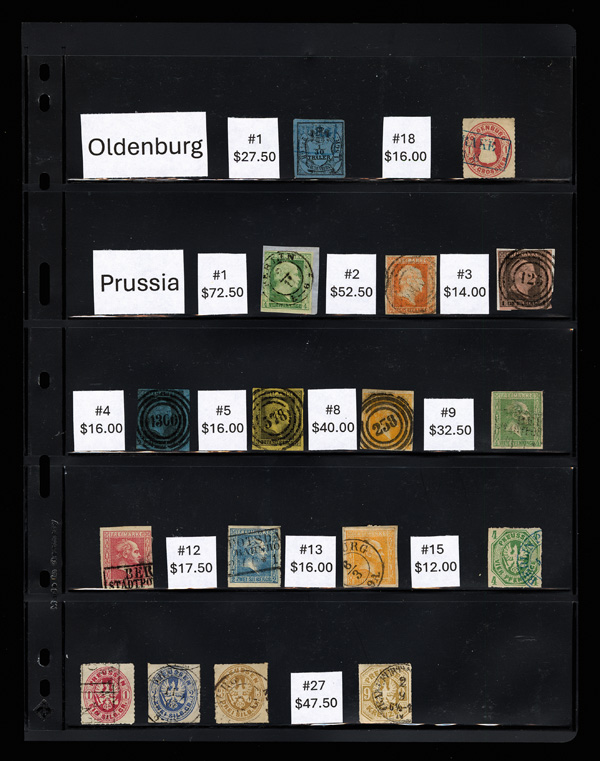 8194   imageGerman States, Pre-Empire adhesives 1850-1862, 16 different postally used German States on a Vario page; Oldenburg #1 and 18; and Prussia 1//27; proud additions to any collection; catalog $385, Very Fine. (Image) Suggested Bid $100