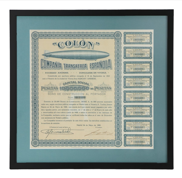 8299 ephemera bond imageSpain, "Colon" Capital Bond with Coupons, beautiful signed 10,000,000 pesetas bond with eight attached coupons nicely matted and framed in 16" square frame; a great piece. Shipping charges apply - weight 3.6 lbs. (Image) Suggested Bid $105