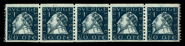 8305 nh 165 image1920, 20ö Gustavus Adolphus (Scott 165), strip of 5 with leader end at right, o.g., never hinged, Fine to Very Fine.