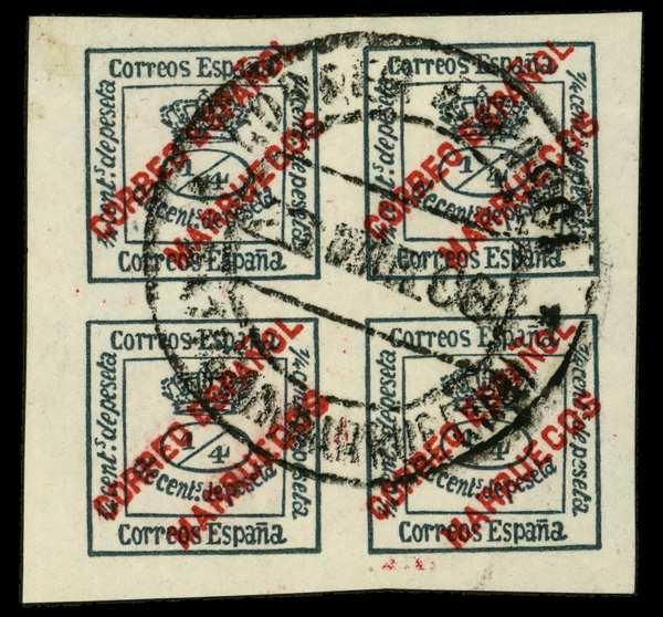 8300 Obl 1 image1903, ¼c blue green overprinted in carmine complete block (Scott 1), block of 4, Extremely Fine.
