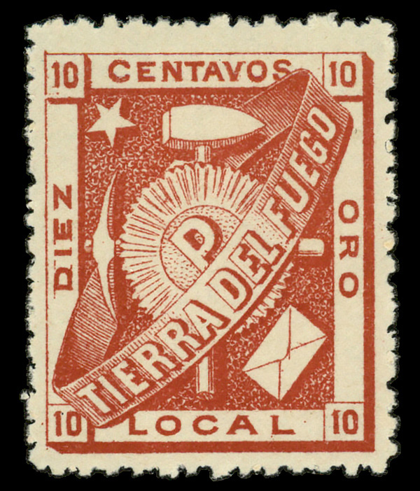 8319 nh l-tdf image1900, 10c red Tierra Del Fuego Oro, single, Very interesting local label Tierra Del Fuego Oro translates to "Land on Fire Gold"., o.g., never hinged, Very Fine.
