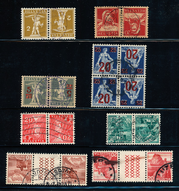 8310   imageSwitzerland, Popular Tete beche pairs 1909-1938, always fascinating used collection of Tete beche pairs from Switzerland on a black stock page; includes #146a, 176a, 195a, 199a (2), 223a, 228a, 230Bd, and 243a; catalog $200. (Image) Suggested Bid $50