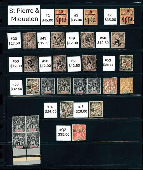 8301   imageSt. Pierre & Miquelon, 19th century goodness 1885-1892, 24 stamps on a Vario stock page; includes #2//72, J4//J6, and Q2; catalog $400. (Image) Suggested Bid $75