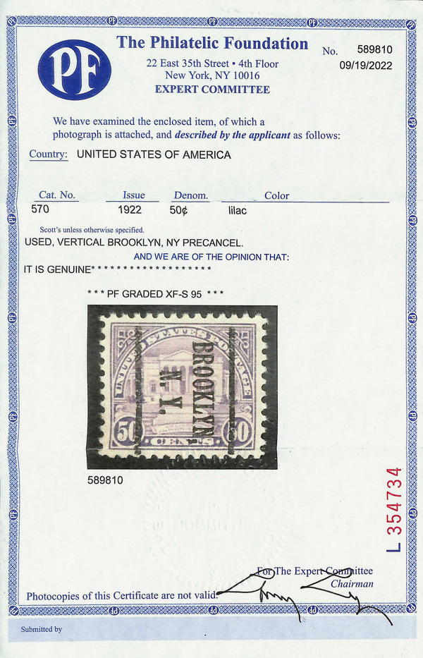 7166 O 570 image1922, 50¢ Arlington Amphitheater (Scott 570), Extremely Fine to Superb, with 2022 P.F. certificate graded XF-SUP 95.