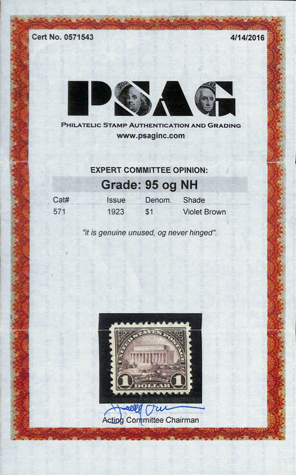 7167 nh 571 image1923, $1 Lincoln Memorial (Scott 571), o.g., never hinged, sound and Post Office fresh with two-toned color on pristine paper, Extremely Fine to Superb, with 2016 P.S.A.G. certificate graded XF-SUP 95.