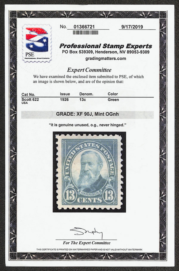 7189 nh 622 image1926, 13¢ Harrison (Scott 622), oversized margins with ideal centering, o.g., never hinged, Extremely Fine, with 2019 P.S.E. certificate graded XF 90J.