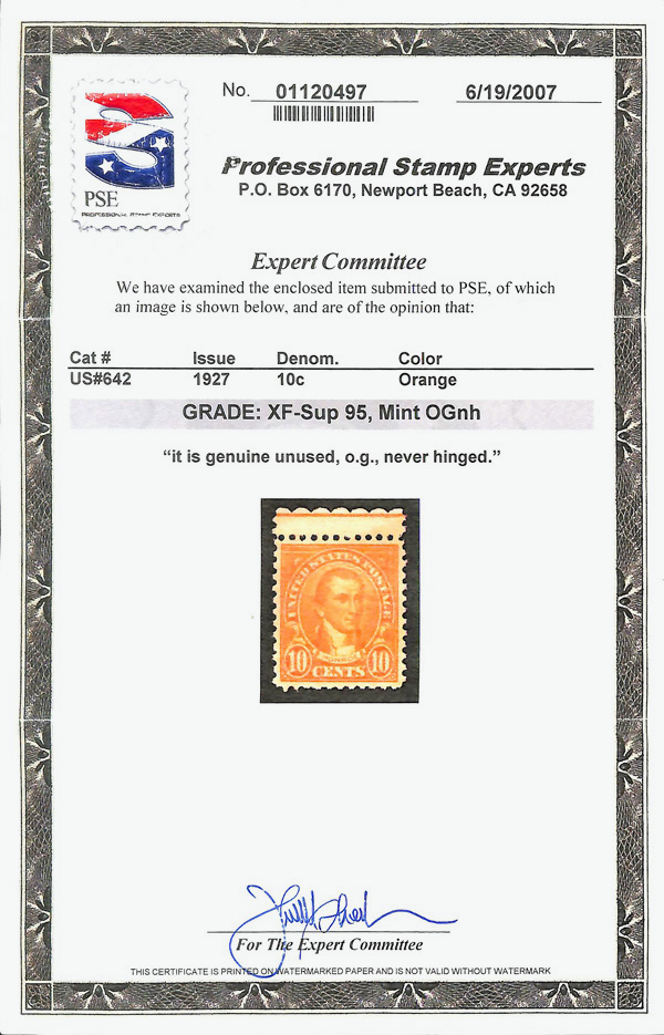 7197 nh 642 image1927, 10¢ Monroe, rotary press printing (Scott 642), radiant, glowing tone, o.g., never hinged, Extremely Fine to Superb, with 2007 P.S.E. certificate graded XF-SUP 95.