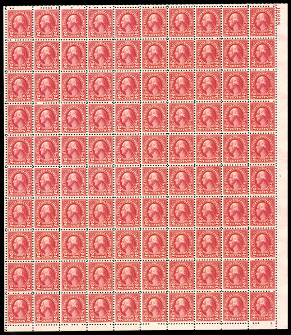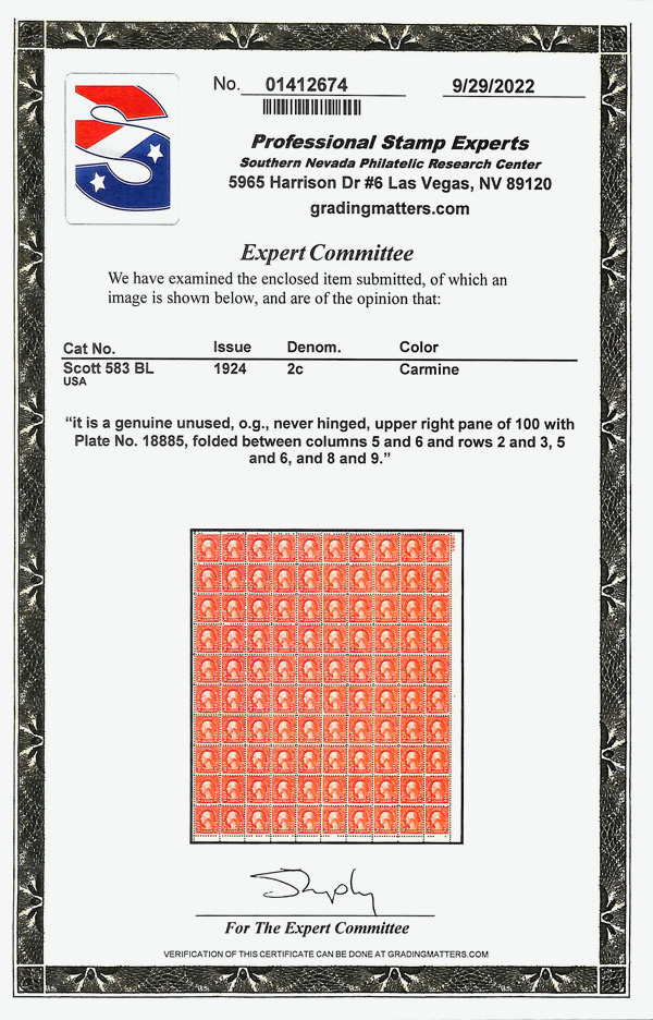 7178 nhbl 583 image1924, 2¢ Washington, rotary press printing, perf. 10 (Scott 583), top right full pane of 100 with plate number 18885, o.g., never hinged, crisply printed in rich color, intact with full perforations; folded between columns 5/6 and rows 2/3, 5/6 and 8/9, Fine to Very Fine, with 2022 P.S.E. certificate.