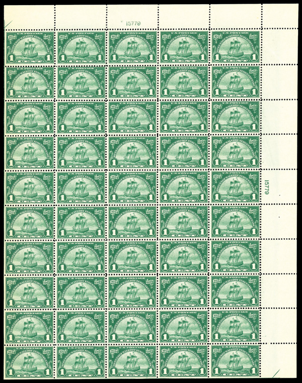 7186 nhbl 614 image1924, 1¢ Huguenot-Walloon (Scott 614), top right full pane of 50 with plate number 15779, o.g., never hinged, Post Office fresh with rich color and sharp detail; perf separations, Fine to Very Fine, with 2022 P.S.E. certificate.