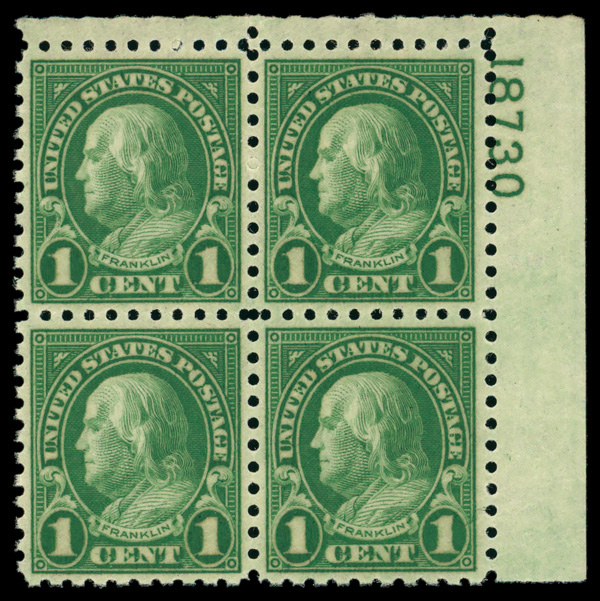 7177 nhbl 581 image1923, 1¢ Franklin, rotary press printing, perf. 10 (Scott 581), plate block of 4, o.g., never hinged, Very Fine.