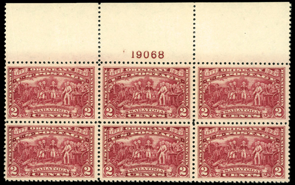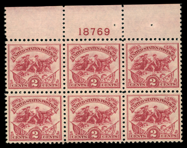 7198 nhbl 644 image1927, 2¢ Burgoyne (Scott 644), top margin plate block of 6, Handsome bright, clear appearance, o.g., never hinged, Very Fine.