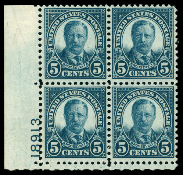 7196 nhbl 637 image1927, 5¢ Roosevelt, rotary press printing (Scott 637), plate block of 4, o.g., never hinged, Very Fine.