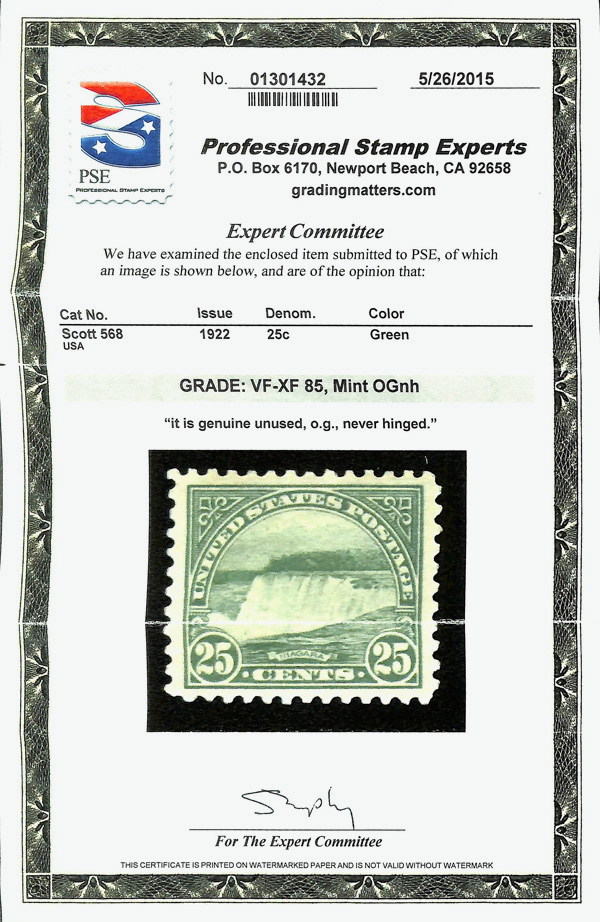 7161 nh 568 image1922, 25¢ Niagara Falls (Scott 568), o.g., never hinged, Very Fine to Extremely Fine, with 2015 P.S.E. certificate graded VF-XF 85.
