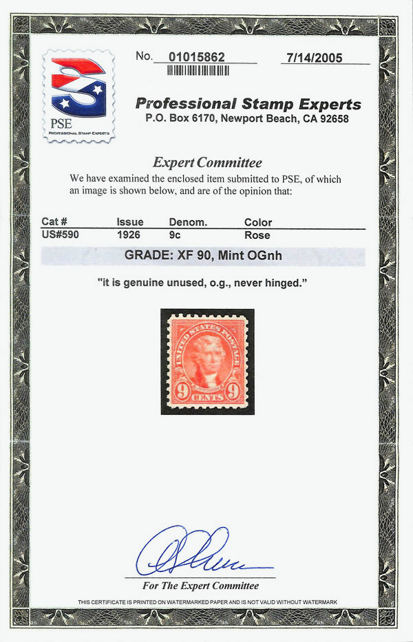7179 nh 590 image1926, 9¢ Jefferson, rotary press printing, perf. 10 (Scott 590), o.g., never hinged, Extremely Fine, with 2005 P.S.E. certificate graded XF 90.