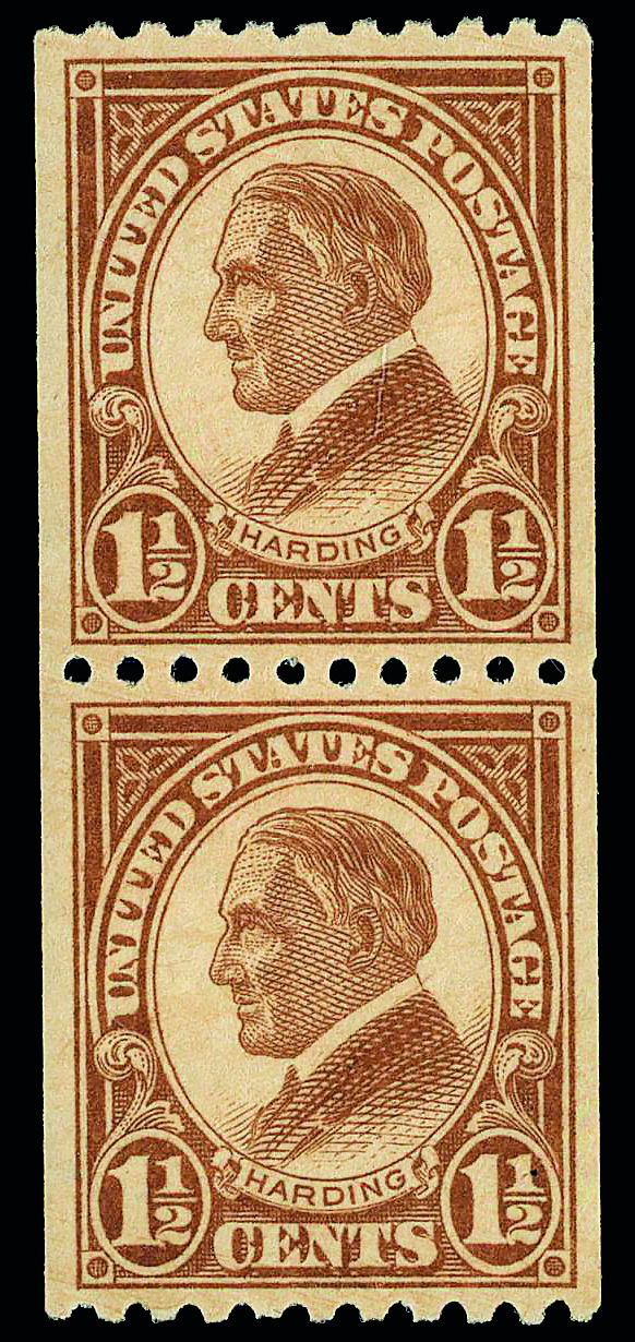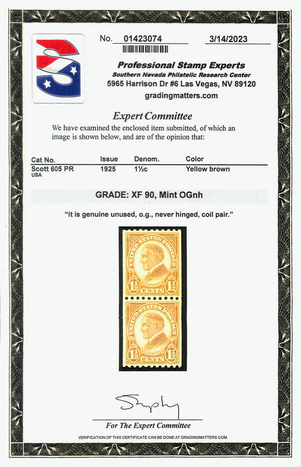 7182 nh 605 image1925, 1½¢ Harding, rotary press coil, perf. 10 horizontally (Scott 605), pair, o.g., never hinged, Extremely Fine, with 2023 P.S.E. certificate graded XF 90.