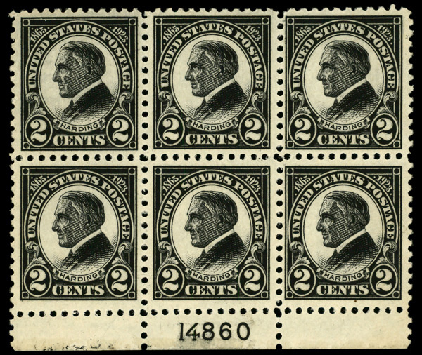 7183 nhbl 610 image1923, 2¢ Harding, flat plate printing, perf. 11 (Scott 610), plate block of 6, o.g., never hinged, Very Fine to Extremely Fine.