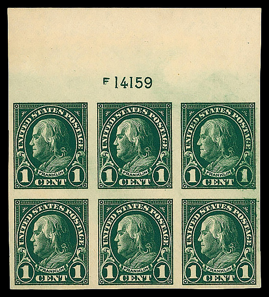 7172 nhbl 576 image1925, 1½¢ Harding, imperf. (Scott 576), plate block of 6, o.g., never hinged (minor gum crease), Very Fine to Extremely Fine.