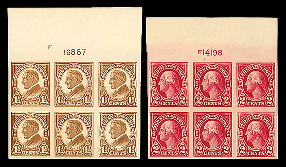 7170 nhbl 575-577 image1923-25, flat plate imperfs., 1¢ to 3¢ complete (Scott 575-577), set of 3, plate blocks of 6, o.g., never hinged, Very Fine to Extremely Fine.