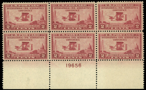 7191 nhbl 627 image1926, 2¢ Sesquicentennial Exposition (Scott 627), plate block of 6, o.g., never hinged, Very Fine to Extremely Fine.