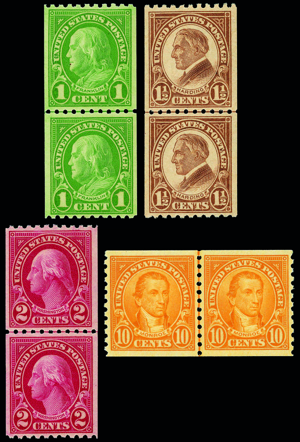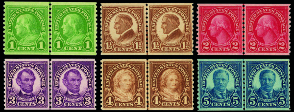 7180 nh 597-599, 600-606 image1923-25, 1¢-10¢ Regular Issue Coils (Scott 597-599, 600-606), set of 10, joint line pairs, o.g., never hinged, Very Fine to Extremely Fine.