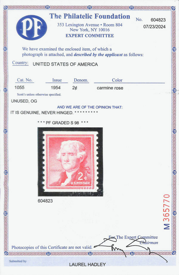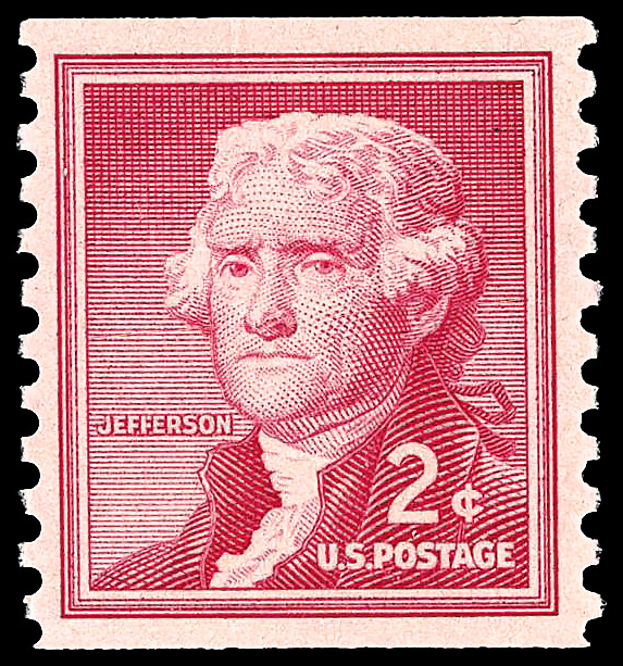 7303 nh 1055 image1954, Liberty Issue, 2¢ Jefferson, horizontal coil, large perf. holes, wet printing (Scott 1055), o.g., never hinged, Superb, with 2024 P.F. certificate graded SUP 98.