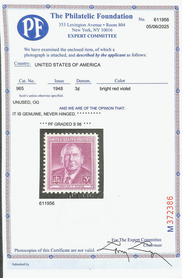 7290 nh 965 image1948, 3¢ Harlan F. Stone (Scott 965), o.g., never hinged, Superb, with 2025 P.F. certificate graded SUP 98.