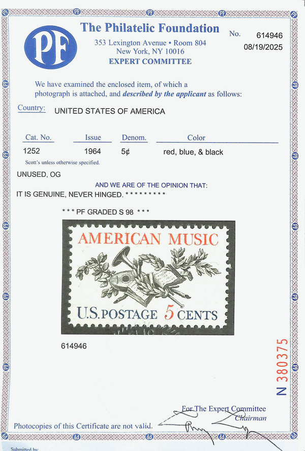 7314 nh 1252 image1964, 5¢ American Music (Scott 1252), o.g., never hinged, Superb, with 2025 P.F. certificate graded SUP 98.