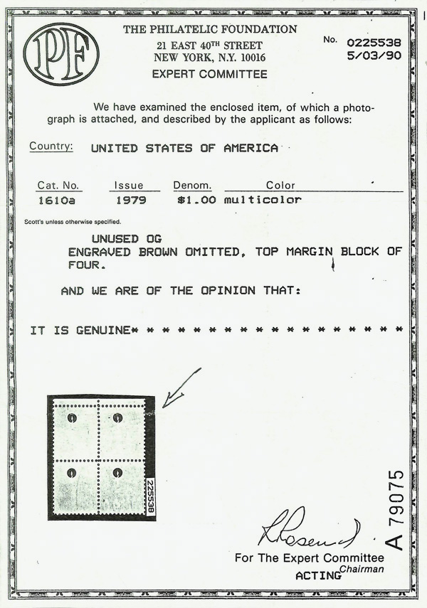7319 nh 1610a image1979, $1 Rush Lamp, brown (engraved) omitted (Scott 1610a), o.g., never hinged, Extremely Fine, with photocopy of 1990 P.F. certificate for block.