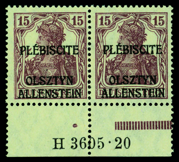 9539 nh 4 image1920, Germany 4pf violet brown 'ALLENSTEIN' overprint (Scott 4), bottom margin pair with HAN #, left stamp with damaged 'P' in overprint, o.g., never hinged, Fine to Very Fine.
