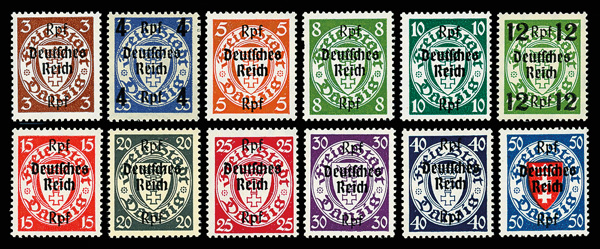 9545 O 241-254 image1939, 3pf-2m on 2g 'Deutsches Reich' overprint, complete (Scott 241-254), set of 14, Very Fine.