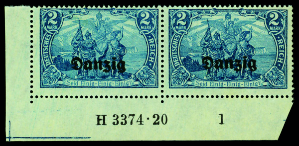 9540 nh 11 image1920, Germany 2m blue 'Danzig' overprint (Scott 11), corner margin pair with HAN A#, o.g., never hinged, Fine.