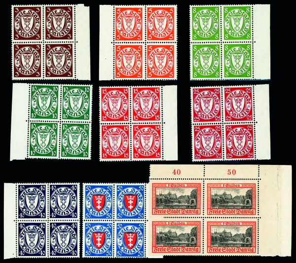9543 nhbl 225-233 image1938-39, 3pf-1g Arms & Scene, complete (Scott 225-233), set of 9, blocks of 4, o.g., never hinged, Very Fine.