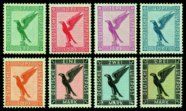 9531 nh C27-C34 imageAirmail, 1926-27, 5pf-3m Eagle complete (Scott C27-C34), o.g., never hinged, Very Fine.