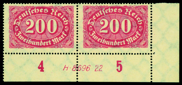 9522 nh   image1922, 200m bright red, bottom margin pair with HAN #, o.g., never hinged, Fine to Very Fine, signed Oechsner.