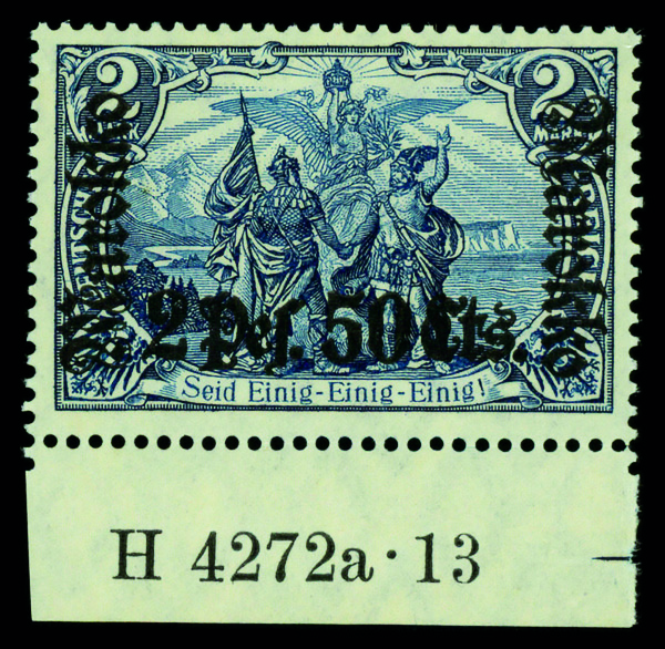 9538 nh   image1911, 2p50c on 2m blackish blue 'Marokko' overprint, bottom margin single with HAN #, o.g., never hinged, Very Fine to Extremely Fine.